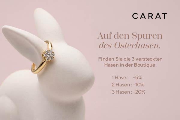 Konditionen : Die Rabatte gelten auf allen Carat-Schmuckstücken, ausgenommen, Trauringe, Externe Marken, Services und Reparaturen. Nicht kumulierbar mit anderen Angeboten oder Kundenkarte. Das Spiel läuft bis einschliesslich Ostermontag.