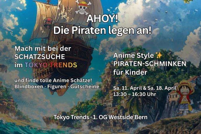 Kommt vorbei und macht mit bei der grossen Anime Schatzsuche: Blindboxen, Figuren und Gutscheine warten auf euch. Und das Beste? An den Samstagen 11. und 18. April (13:30–16:30 Uhr) verwandeln wir eure Kinder in echte Anime-Piraten, ob Piratenkönig Luffy, Piratenkönigin Nami oder süsser Hello Kitty mit einem Touch ARRR — kostenloses Schminken, einfach vorbeikommen, keine Anmeldung nötig!