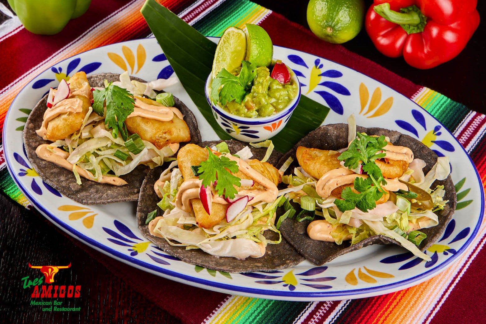 Blaue Maistortillas belegt mit unserer hausgemachten Chipotlesauce, frittiertem Dorschfilet im Backteig, eingelegten Kabisstreifen, Eisbergsalat, Frühlingszwiebeln und Koriander. Dazu servieren wir unsere hausgemachte Guacamole.