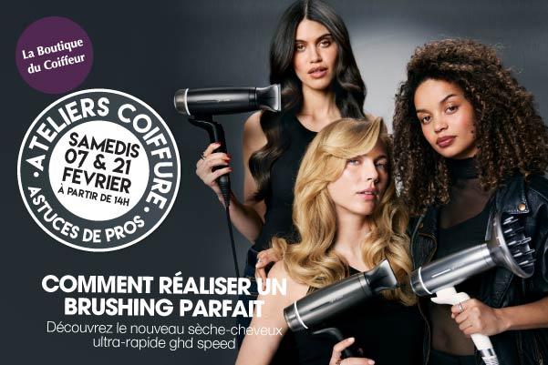 Participe à nos Ateliers Coiffure les 7 et 21 février pour apprendre à réaliser un brushing parfait pour la Saint-Valentin avec le sèche-cheveux Speed de GHD !