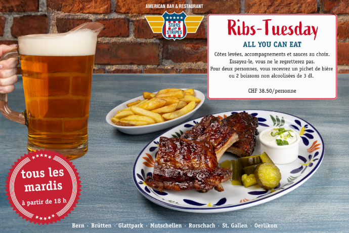 Le Stars and Stripes au Westside t’invite chaque mardi dès 18h au Ribs Tuesday – All You Can Eat. Parfait pour toi si tu raffoles de viande tendre, de marinade savoureuse et d’une vraie ambiance American BBQ.