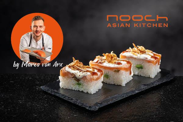 Saumon, avocat et jalapeños au tajín s'associent pour former un rouleau addictif. Le tout est garni de crème au fromage, de sauce teriyaki et d'oignons grillés. Crémeux, frais, croustillant – par Marco von Arx. ✨🍣