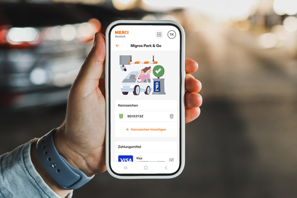 - Via le service Migros Park & Go > il suffit d’enregistrer une fois votre plaque et votre moyen de paiement préféré dans votre compte Migros